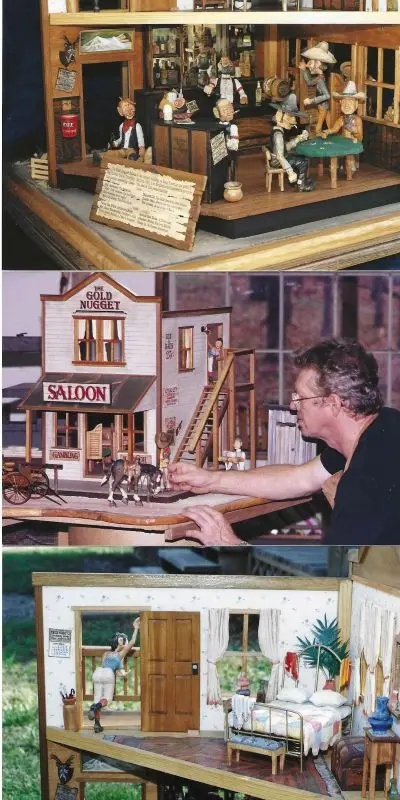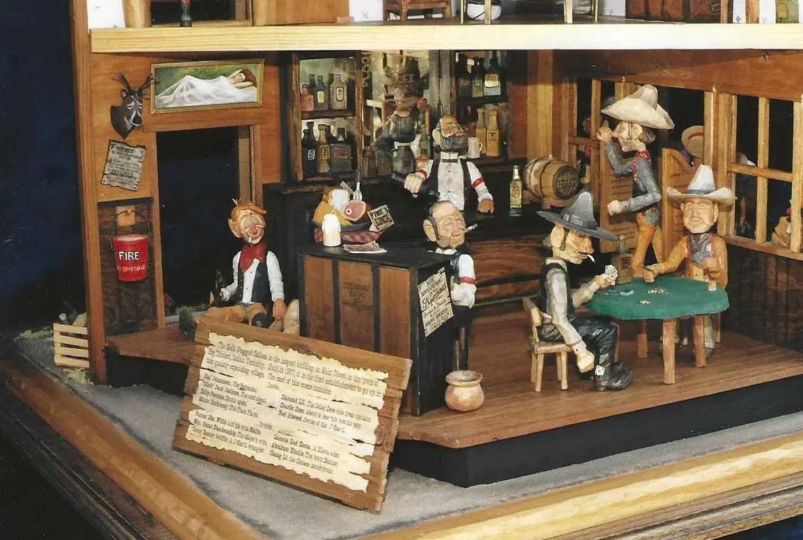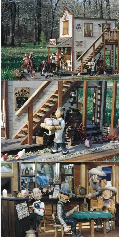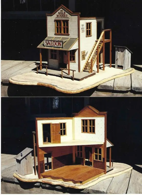 This is the first and largest scene I’ve done. It was completed back in 1997. As you can see in the associated photos there is a lot going on at the Gold Nugget. From Diamond Lil beckoning and newly arrived Cowboy to come up and test her brass bedsprings to the cheating cardshark reaching for the Ace stuffed in his pants cuff. Chang Li has the shirts all pressed and is making his delivery while the nester and his wife from out west of town are on their way home after completing their monthly resupply trip. The Banker doffs his hat to the Mayor’s wife while the chickens peck and scratch and dodge the traffic on Main Street. There’s lots to see no matter where you look.